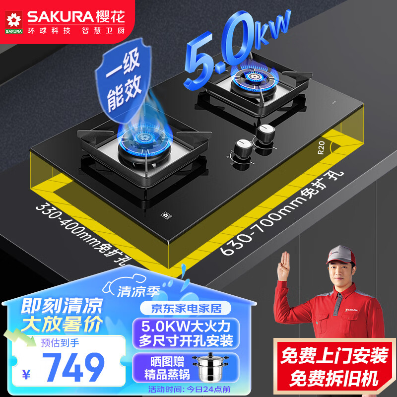 樱花(SAKURA)燃气灶天然气大火力家用双灶一级能效5.0kW大火力大面板宽边底壳多尺寸免扩孔可安装JGC01天然气价格:848.00元!