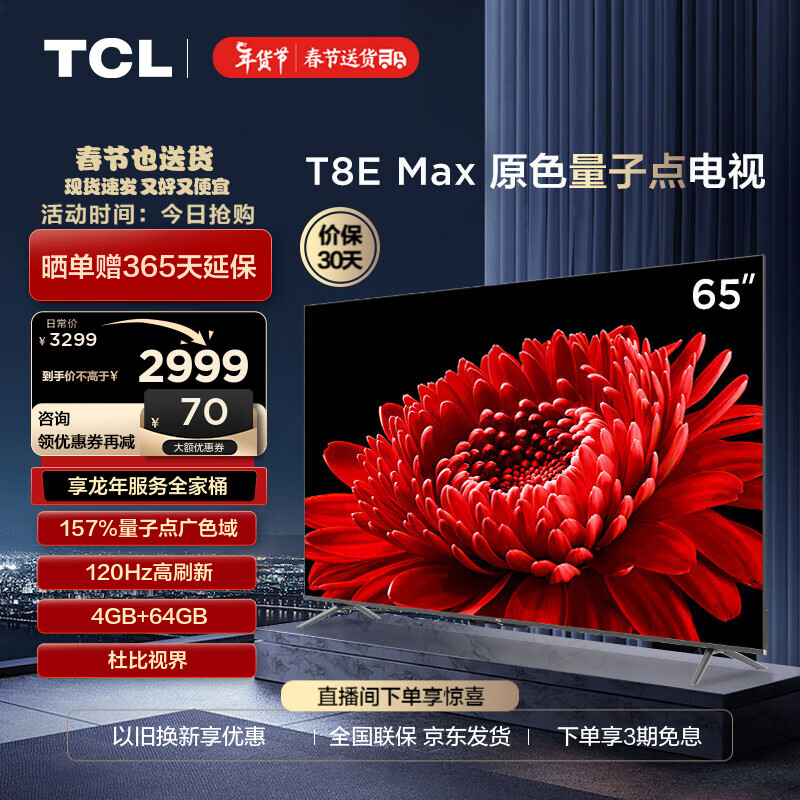 TCL电视 65T8E Max 65英寸 全新升级版 QLED量子点Pro 120Hz MEMC 4+64G 平板电视机 以旧换新价格:2999.00元!