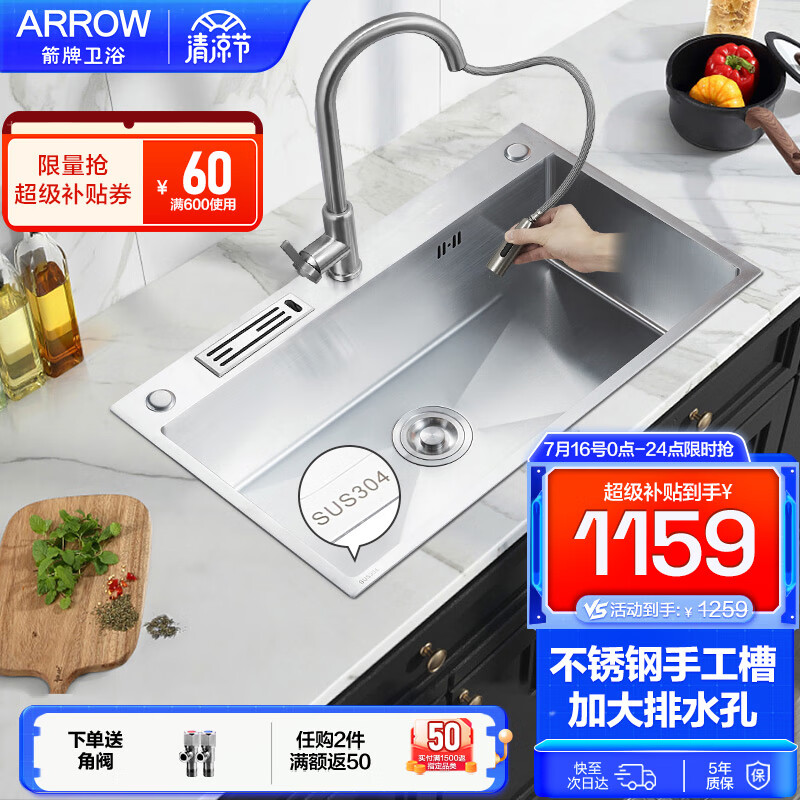 箭牌(ARROW) 304不锈钢加厚手工水槽大单槽厨房水槽洗菜盆一体盆大单槽 78*45手工槽(含抽拉龙头)价格:1398.00元!