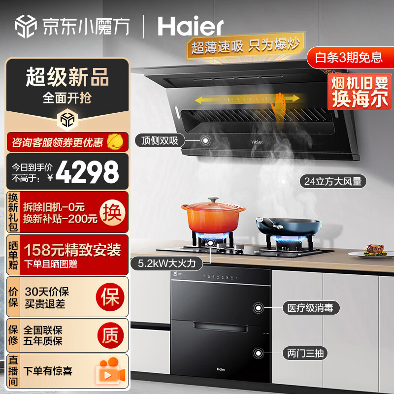 海尔(Haier)抽油烟机 顶侧双吸油烟机燃气灶消毒柜套装 24m3/min大吸力 115L医疗级消毒柜C51+Q2BE3天+E07JU1价格:4298.00元!