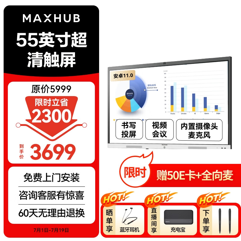 MAXHUB新锐55英寸 会议平板一体机 会议平板智慧屏4K超清屏投影一体机办公室PPT演示办公教学投屏价格:4089.00元!