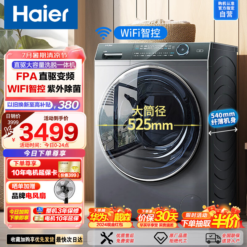 海尔(Haier)洗衣机10公斤超薄全自动滚筒 直驱变频洗衣机 智能投放紫外除菌 WIFI智控 525mm大筒径以旧换新价格:5999.00元!