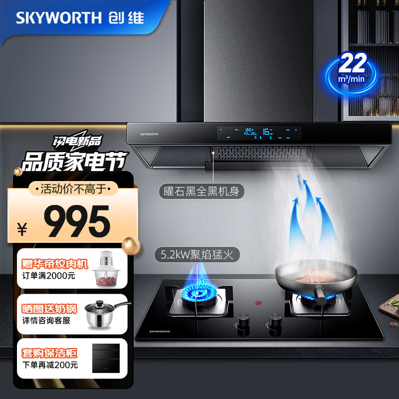 创维(Skyworth)抽吸油烟机灶具套装 欧式顶吸排油烟机燃气灶套餐烟灶 家用22风量自动清洗挥手 Y1H+Z50BS天然气价格:995.00元!