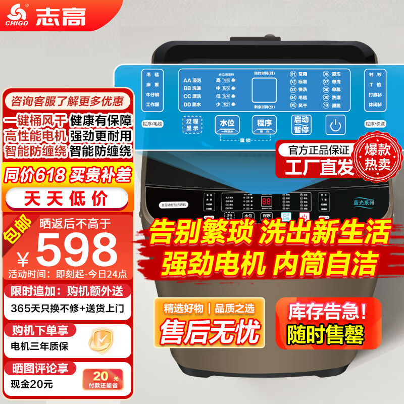 志高(CHIGO)洗衣机15公斤大容量家用商用全自动波轮洗衣机智能洗脱一体机 蓝光洗护强劲电机仿生手洗 金色价格:998.00元!