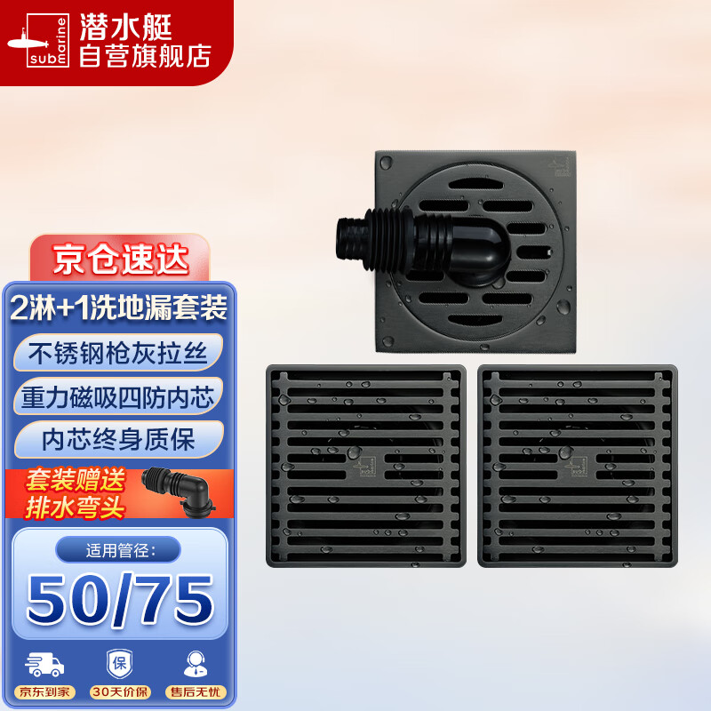 潜水艇(Submarine)枪灰色不锈钢拉丝防臭地漏套装50管 2个淋浴地漏+洗衣机地漏价格:273.00元!