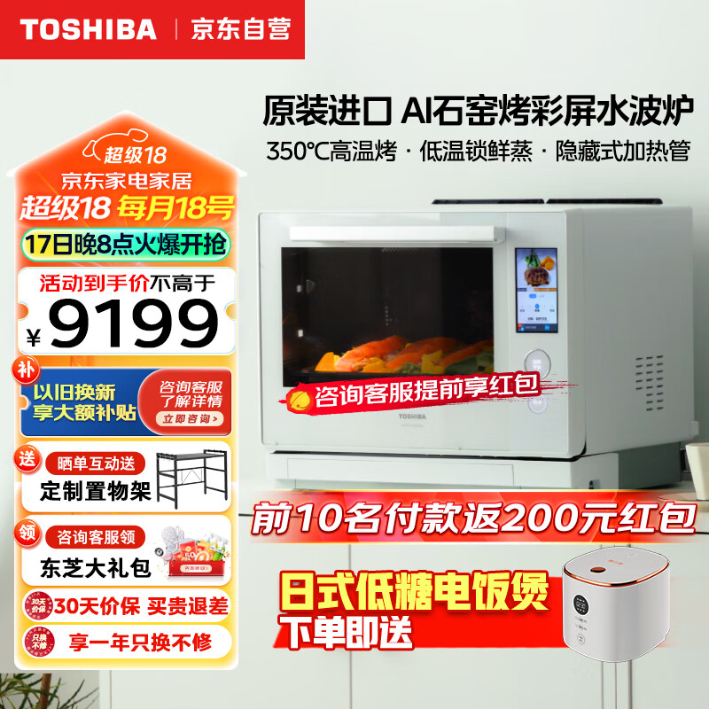 东芝(TOSHIBA)ER-XD7001CNW进口水波炉微蒸烤炸一体机变频微波炉家用蒸烤箱空气炸AI彩屏自动石窑烤30L 白色价格:9199.00元!