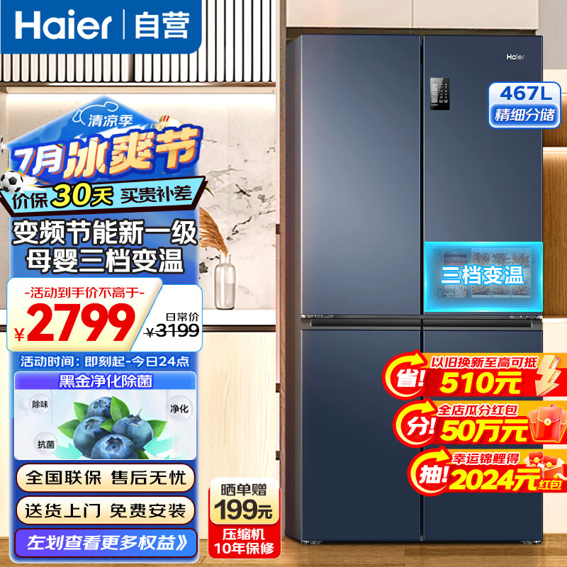 海尔(Haier)冰箱四开门467升 一级能效双变频风冷无霜十字四门多门对开门家用超薄节能大容量电冰箱价格:3199.00元!
