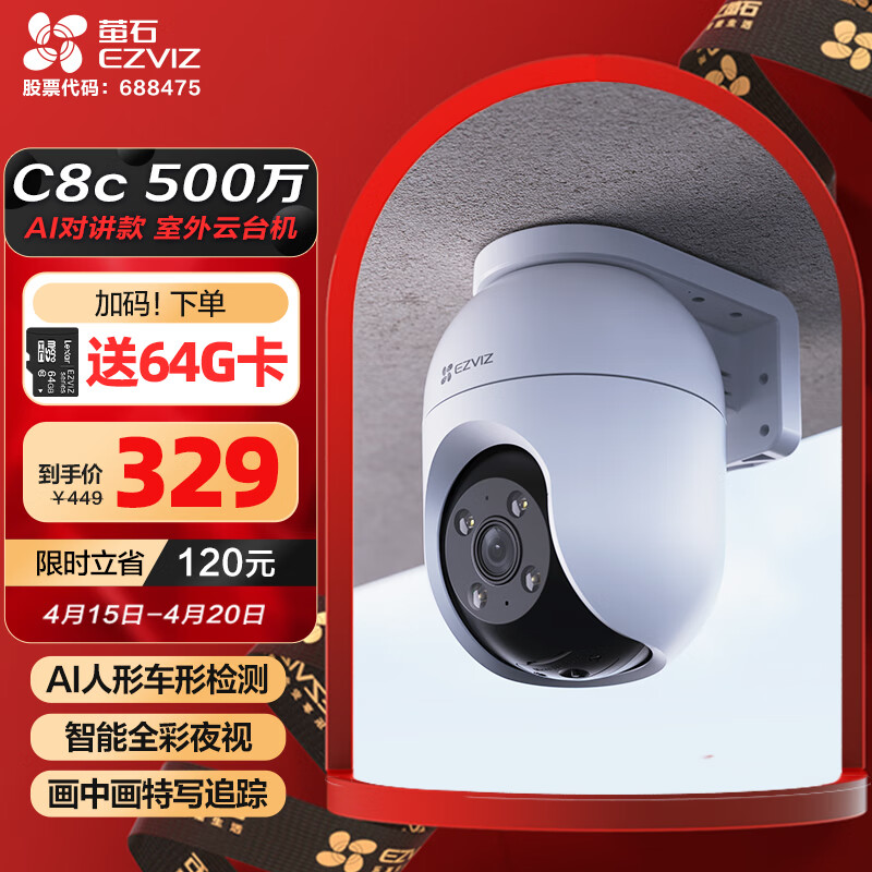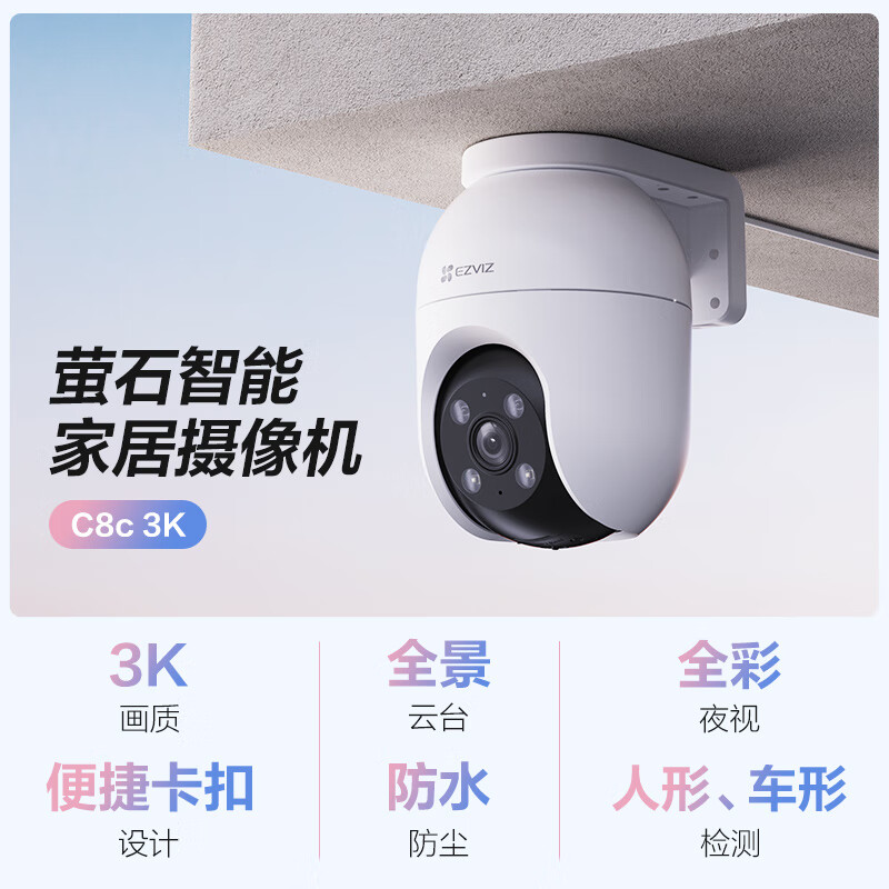 萤石萤石 C8C 500万 6mm摄像头 无线WiFi 室外双云台360° 防水防尘监控 手机远程 人形检测 全彩夜视价格:329.00元!