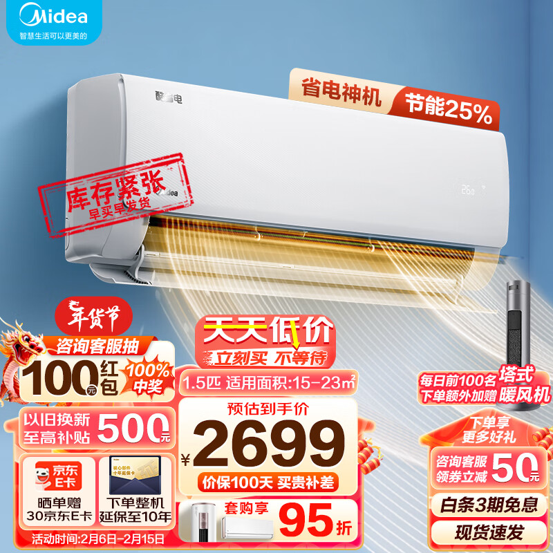 美的(Midea)空调 1.5匹 酷省电 新一级能效 变频冷暖 自清洁 壁挂式空调挂机 智能家电 KFR-35GW/N8KS1-1价格:2699.00元!