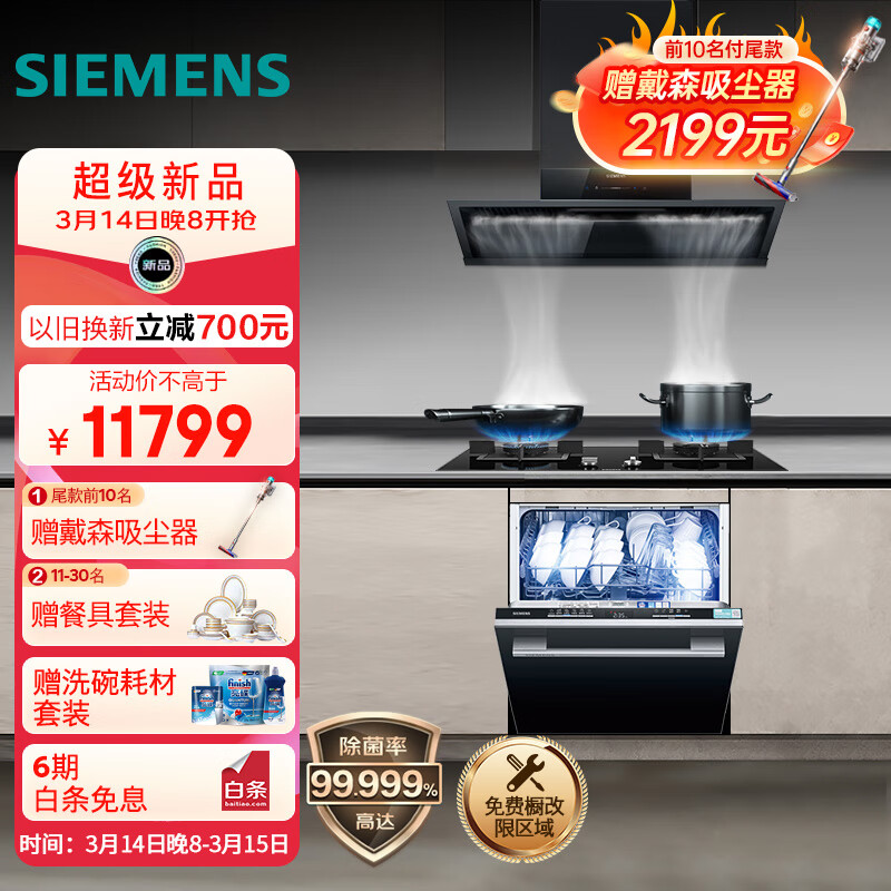 西门子 12套灶下大内腔洗碗机开门烘干+吸油烟机灶具套装(天然气) SE43EB66KC+LSVT1B3BNW+ER8KJF23MP价格:11799.00元!