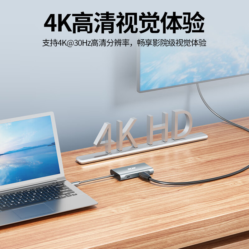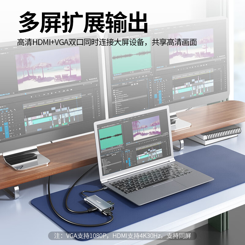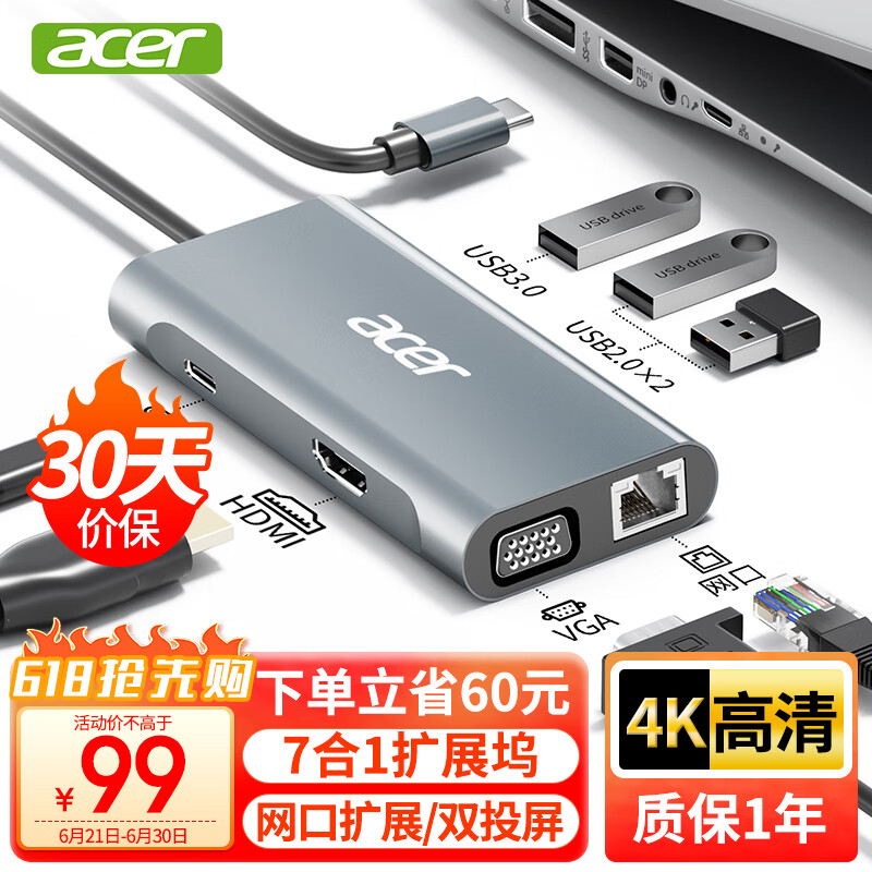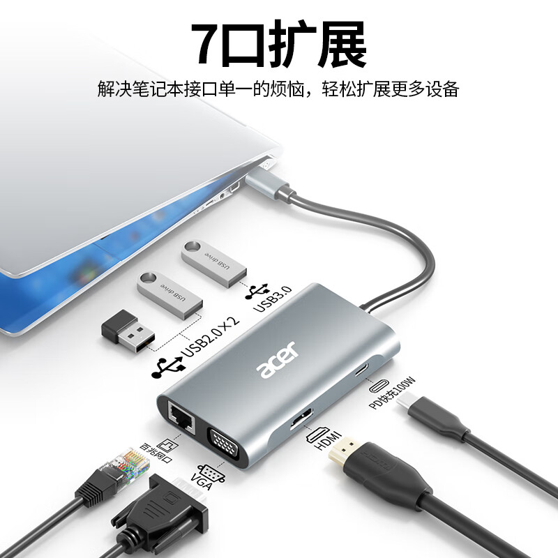 宏碁(acer)Type-C 7合1扩展坞USB分线器HDMI/VGA/网口 适用于笔记本电脑苹果华为转换器转接头价格:159.00元!