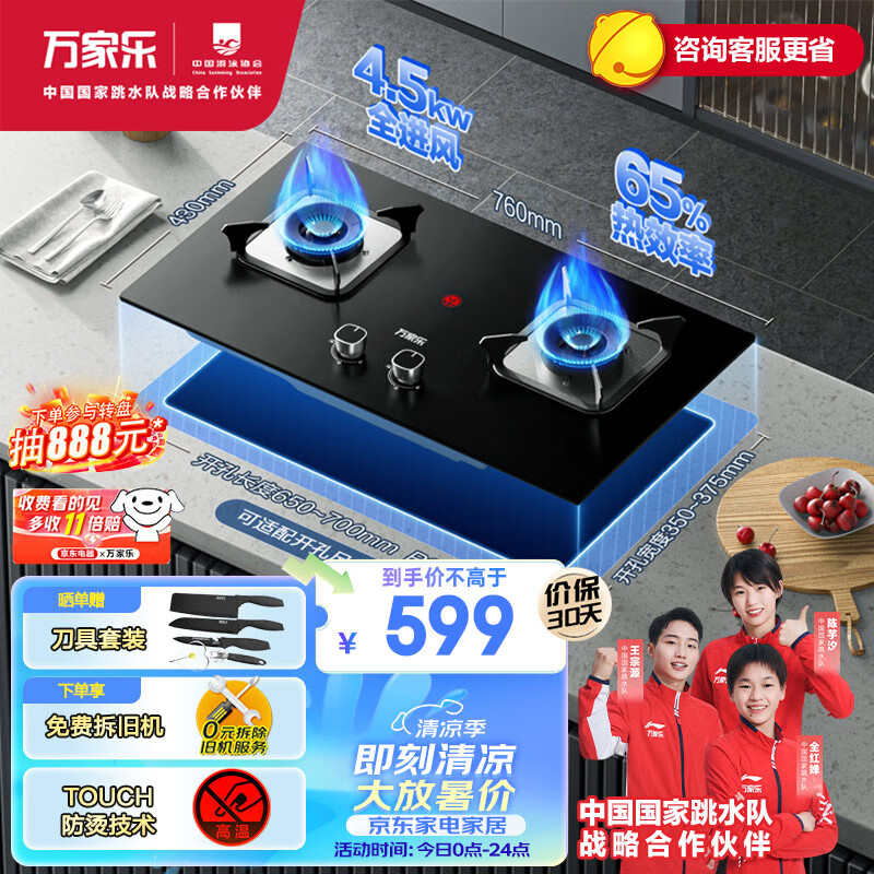 万家乐燃气灶 4.5kW火力 家用台嵌两用煤气灶 钢化玻璃面板 高温防烫提醒 全进风JZY-KV061B液化气价格:699.00元!