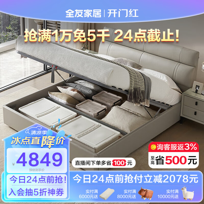 全友家居 真皮艺床头层牛皮现代简约主卧室双人大床高箱储物床105251价格:6927.14元!