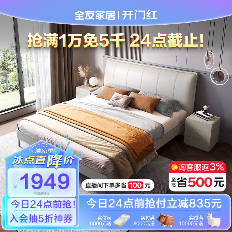 全友家居 1.8x2米主卧双人床现代简约软包床头皮艺床家用高脚床126356价格:2784.29元!
