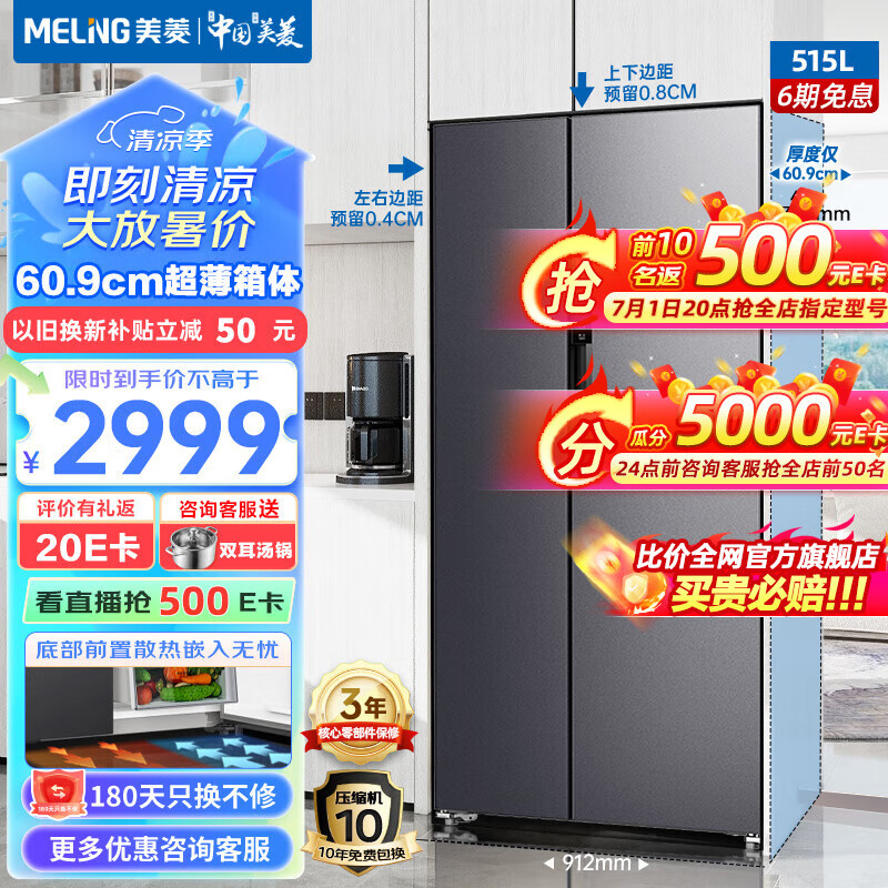 美菱(MeiLing)511/515升对开门冰箱双开门家用大容量一级能效变频风冷无霜底部散热609mm超薄嵌入电冰箱 【无忧嵌】BCD-515WPCZX-神秘灰价格:3199.00元!