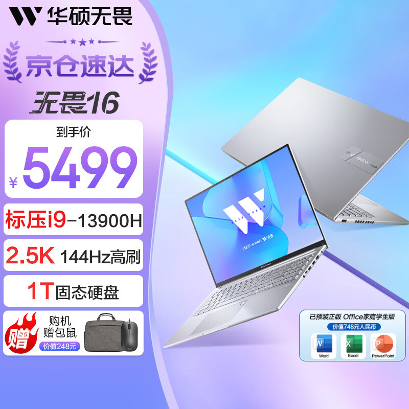 华硕无畏16 13代酷睿i9标压 16英寸Pro级学生手提办公本笔记本电脑轻薄本商务 13代i9-13900H 16G 1T 2.5K屏 144hz 银色价格:5499.00元!