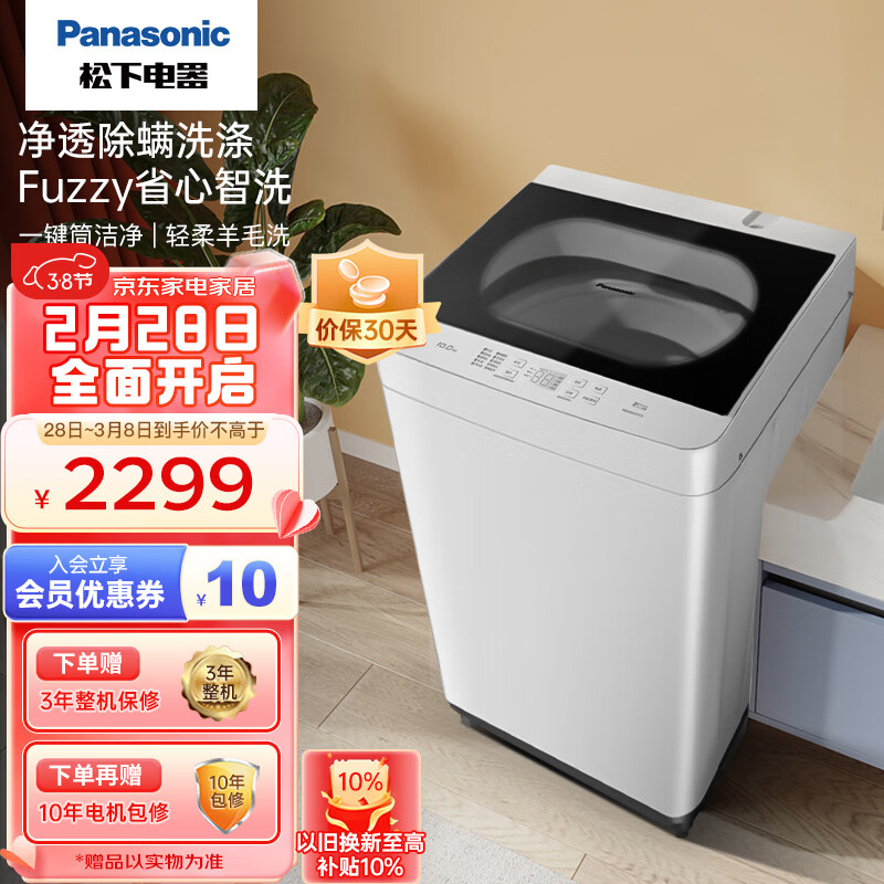 松下(Panasonic)波轮洗衣机全自动10公斤耐脏除螨洗租房家用节能省水羊毛洗羽绒洗桶自洁玻璃一体盖板XQB100-Q17CR价格:2299.00元!