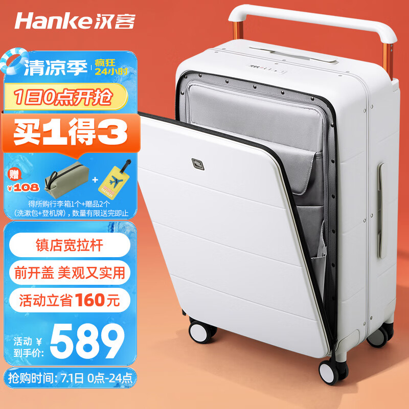 汉客宽拉杆行李箱铝框男前开盖拉杆箱女旅行箱大容量24英寸烟白密码箱价格:749.00元!