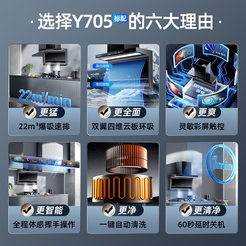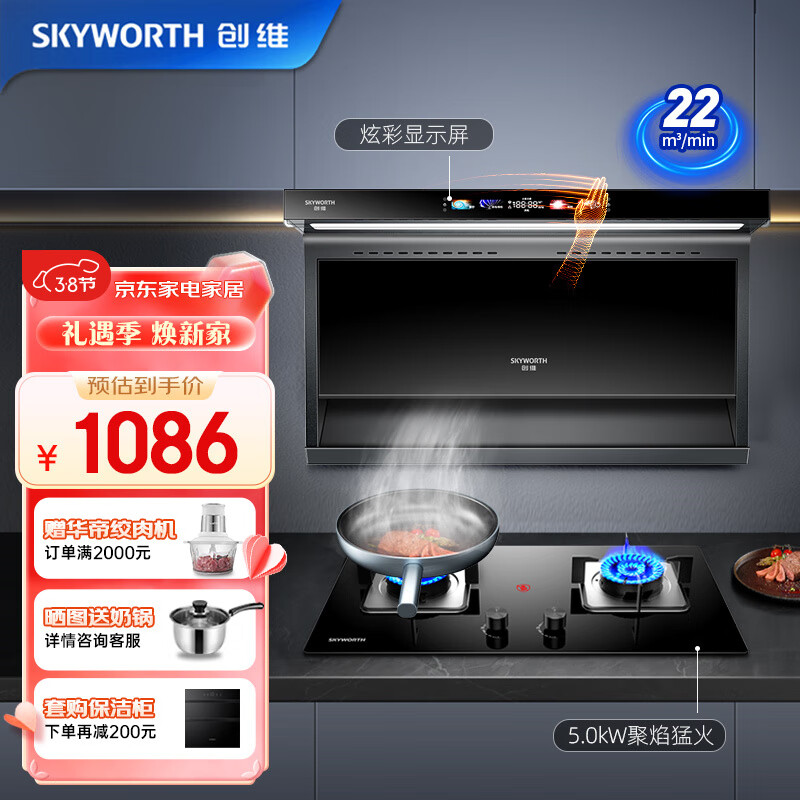 创维(Skyworth)顶侧双吸7字 抽吸油烟机灶具套装家用 大吸力排油烟机燃气灶套餐烟灶自动清洗Y705+Z50BS-1液化气价格:1086.00元!
