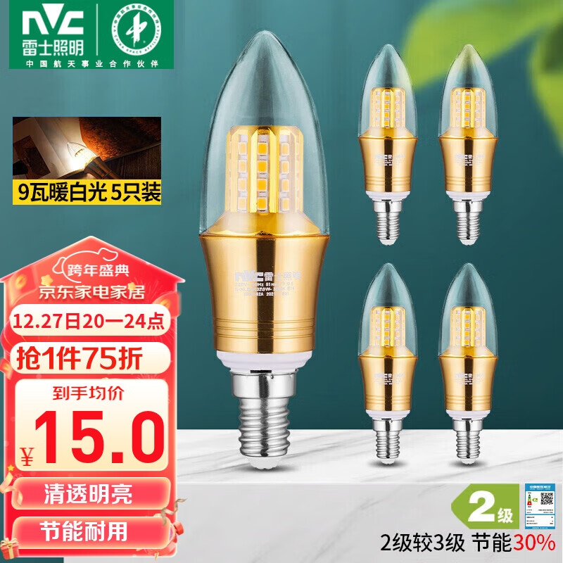 雷士(NVC)LED灯泡尖泡9瓦E14小螺口光源节能灯暖白光4000K金色5只装价格:100.00元!