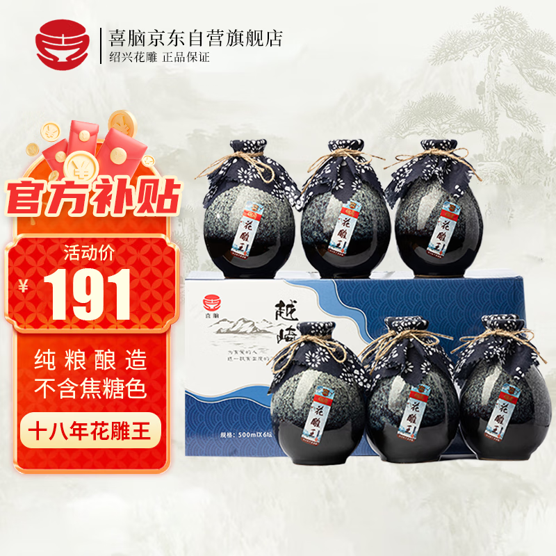 喜脑绍兴黄酒十八年陈酿花雕王无焦糖色坛装糯米酒整箱父亲节送礼价格:220.00元!