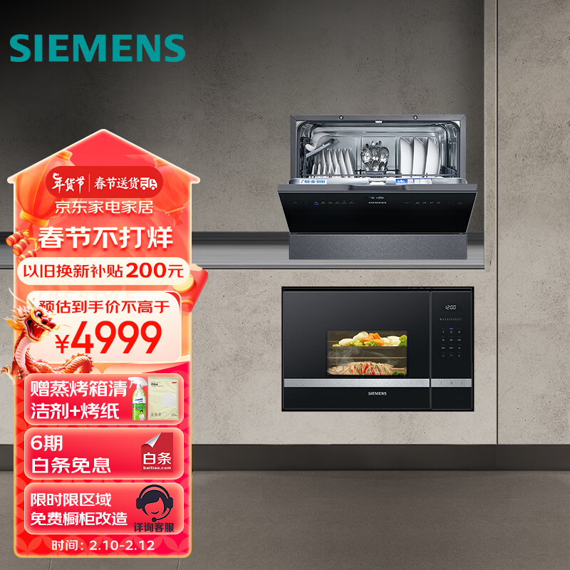 西门子(SIEMENS)洗嵌套装 5套嵌入式台式洗碗机家用 易安装+嵌入式微波炉组合套装 BE525+SK256价格:5199.00元!