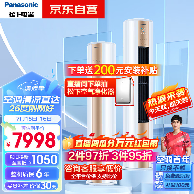 松下空调 净悦星3匹新三级能效 圆柱立式柜机客厅空调变频 纳诺怡除菌洁净 WiFi 以旧换新 ZY72F330N价格:7998.00元!