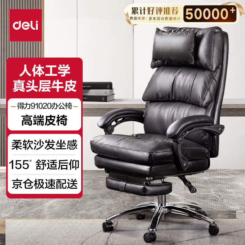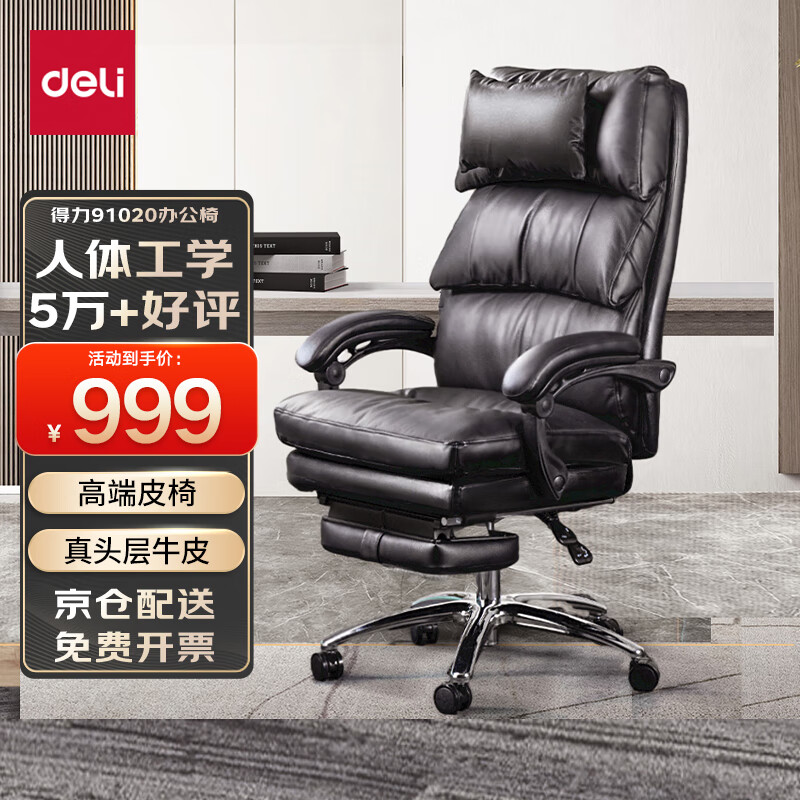 得力(deli)真头层牛皮老板椅 三段式靠背带脚托可躺午休椅 头枕可拆卸 91020价格:1199.00元!