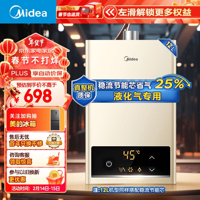 美的(Midea)12升液化气热水器 智能恒温 水气双调 低水压启动 多重安防 大屏显示 JSQ22-HWA(液)价格:698.00元!