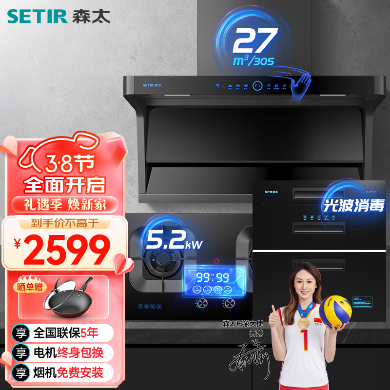 森太(SETIR)抽油烟机套装小户型尺寸顶侧双吸油烟机鸳鸯定时燃气灶消毒柜厨房三件套B822+TM81+F260 天然气价格:2899.00元!