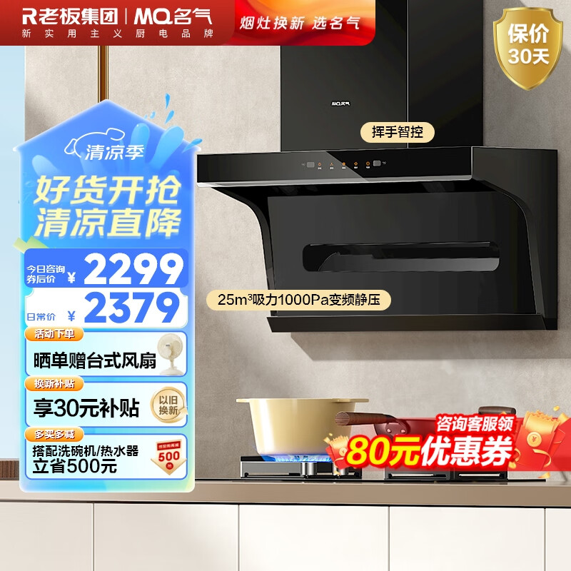 名气(MQ)老板抽油烟机7字型家用顶侧双吸变频侧吸顶吸油烟机25大吸力1000Pa烟灶套装天然气燃气灶5508+6510价格:2379.00元!