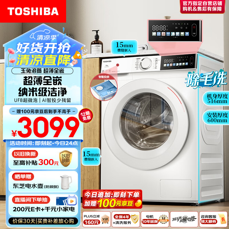 东芝(TOSHIBA)滚筒洗衣机全自动【玉兔单洗DG-10T13BF】超薄全嵌 10公斤大容量 智能投放 彩屏 BLDC变频电机价格:3199.00元!
