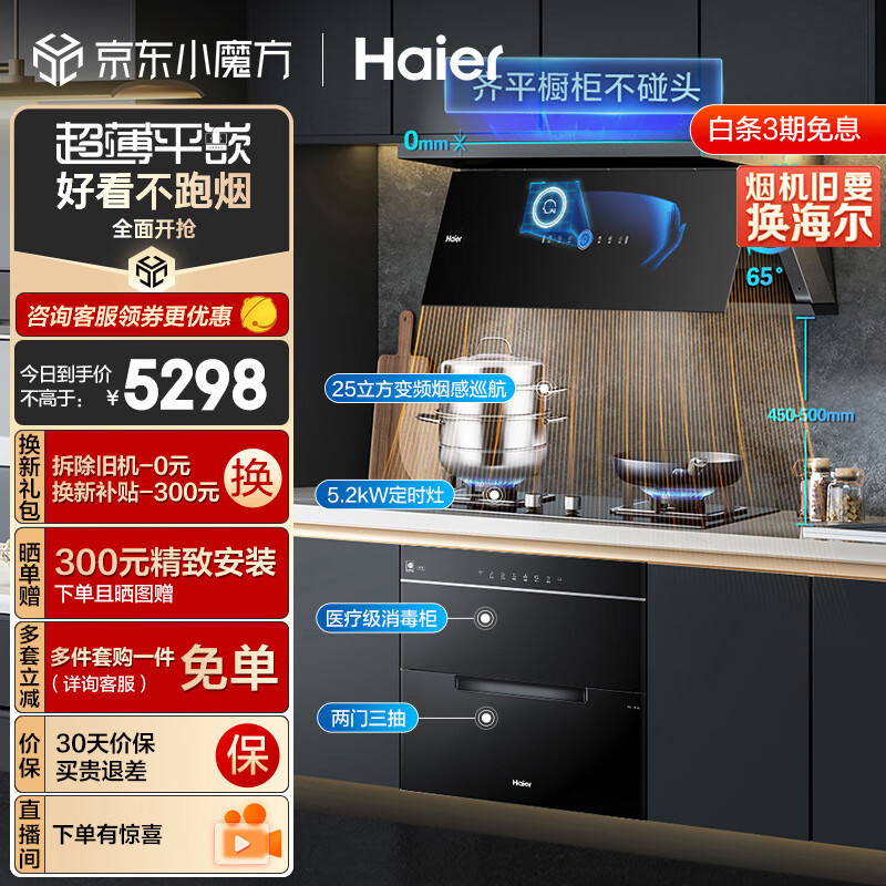 海尔(Haier)平嵌大师系列 烟灶消三件套 25m3/min变频有效风 5.2KW定时灶 医疗级消毒C21U1+Q2BE7天+E07JU1价格:5298.00元!