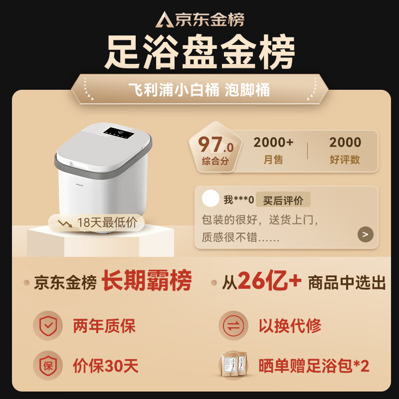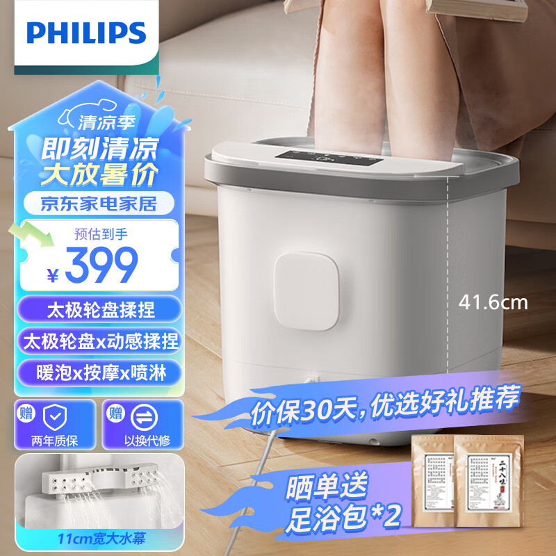 飞利浦(PHILIPS)泡脚桶 恒温加热泡小腿洗脚盆大桶3D电动按摩揉捏加热喷淋足浴盆全自动送长辈男女友礼品3203F白桶价格:429.00元!