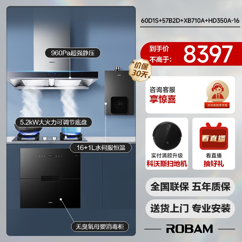 老板(Robam)厨房多件套抽油烟机22风量家用灶具消毒柜水伺服盐系G1燃气热水器60D1S+57B2DT+XB710A+HD350A-16价格:8697.00元!