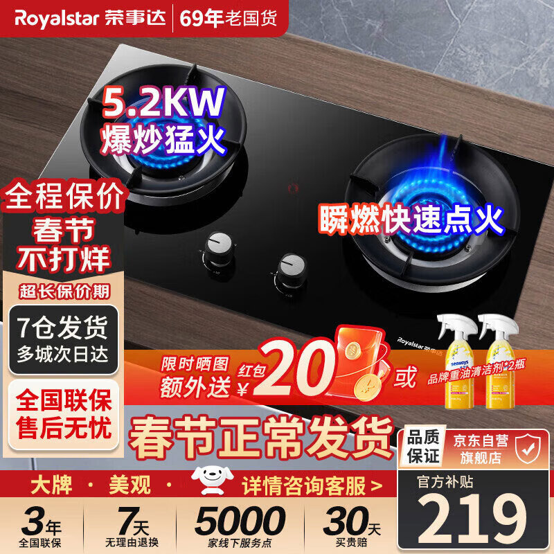 荣事达燃气灶煤气灶双灶天然气灶家用5.2kw大火力猛火灶大面板燃气灶嵌入式煤气灶双灶R204T[家电]价格:218.00元!