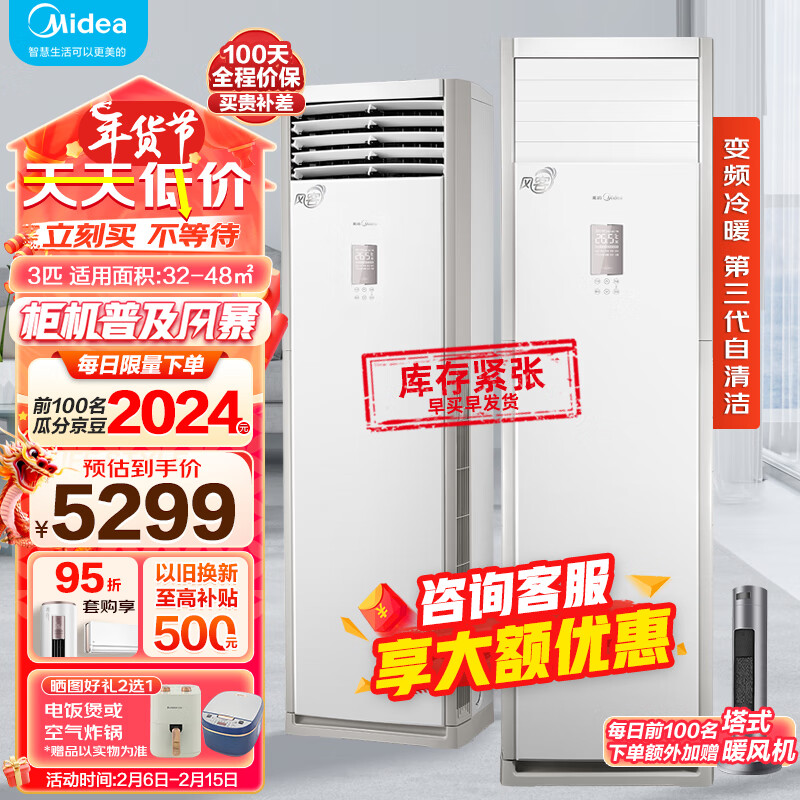 美的(Midea)空调柜机 风客 变频冷暖方形柜机大风量设计落地式立式客厅 3匹KFR-72LW/N8MFB3价格:5299.00元!