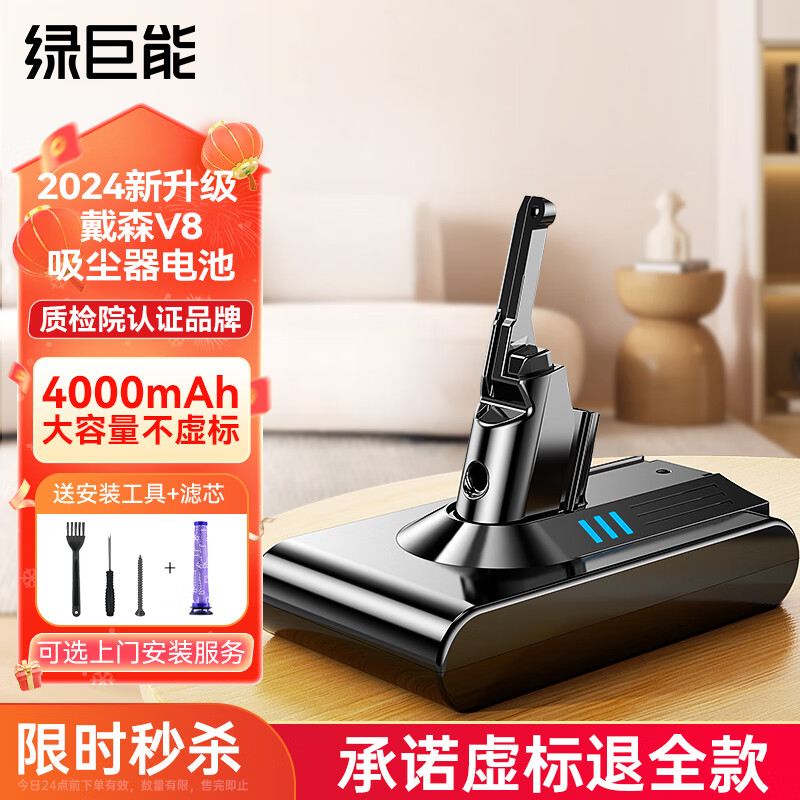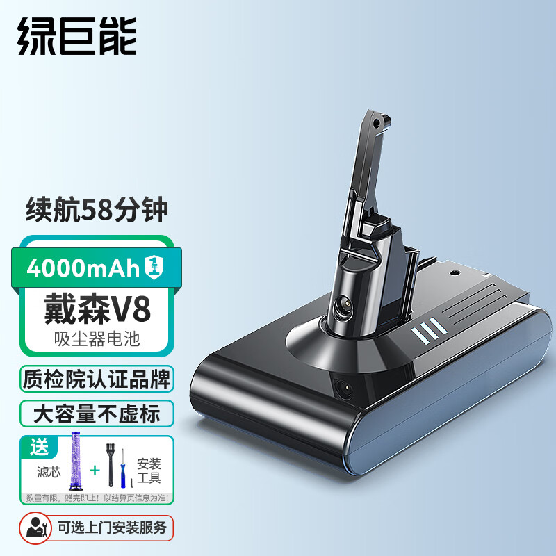 绿巨能(llano)适用戴森Dyson电池V8吸尘器可充电锂电池进口电芯长续航不虚标 容量升级4000mAh价格:389.00元!