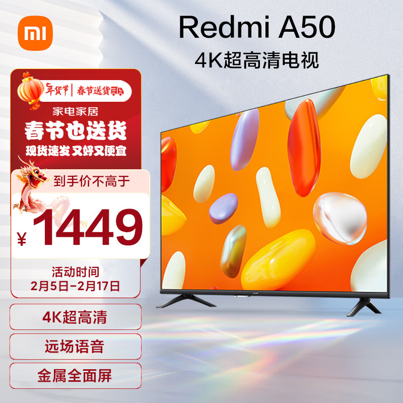 小米电视 Redmi A50 50英寸 2024款 4K超高清远场语音电视 金属屏 智能液晶护眼平板电视L50RA-RA价格:1448.00元!