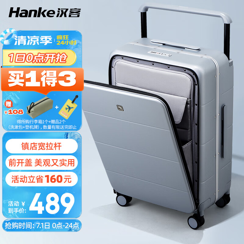 汉客(HANKE)宽拉杆行李箱铝框男前开盖拉杆箱女旅行箱20英寸环保灰登机密码箱价格:649.00元!