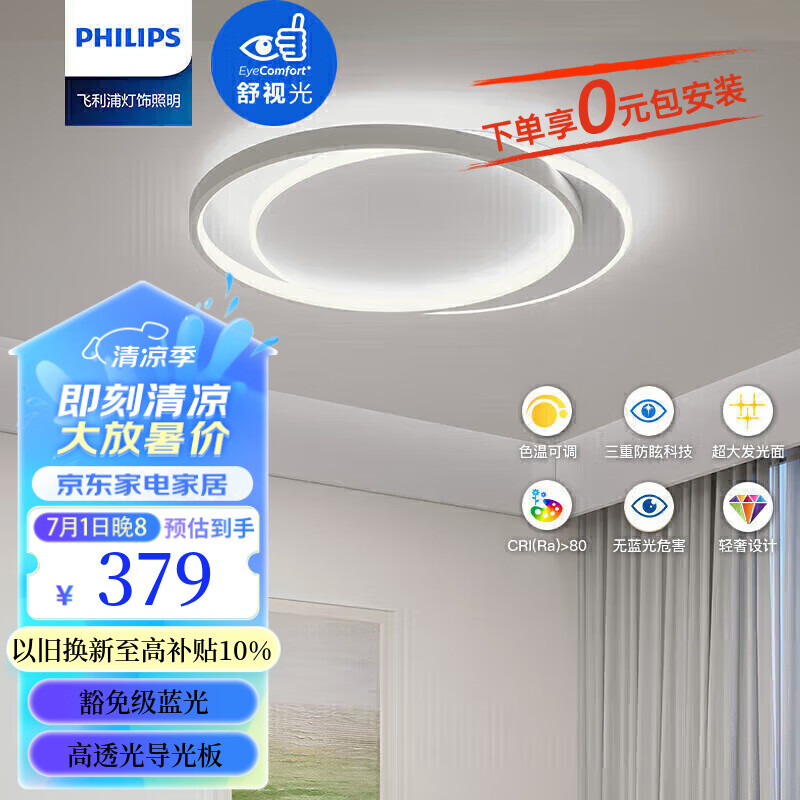 飞利浦(PHILIPS)全光谱LED吸顶灯卧室灯客厅灯书房儿童房灯饰灯具环慕45W皓月白价格:419.00元!