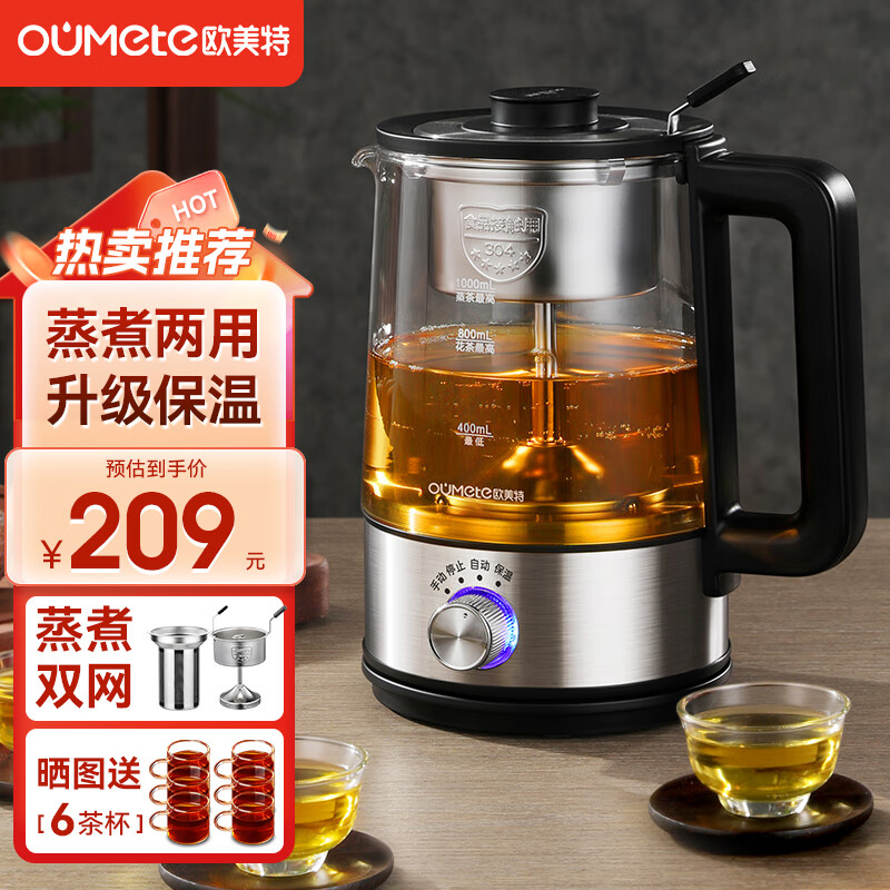 欧美特(OUMETE)煮茶壶煮茶器 喷淋式蒸汽恒温茶壶养生壶玻璃保温煮茶烧水壶蒸茶壶 OMT-PC1020双网配置价格:209.00元!