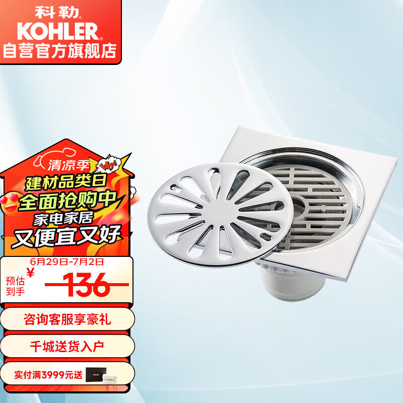 科勒(KOHLER)地漏 密封隔臭地漏K-R7275T-CP浴室五金配件价格:169.00元!