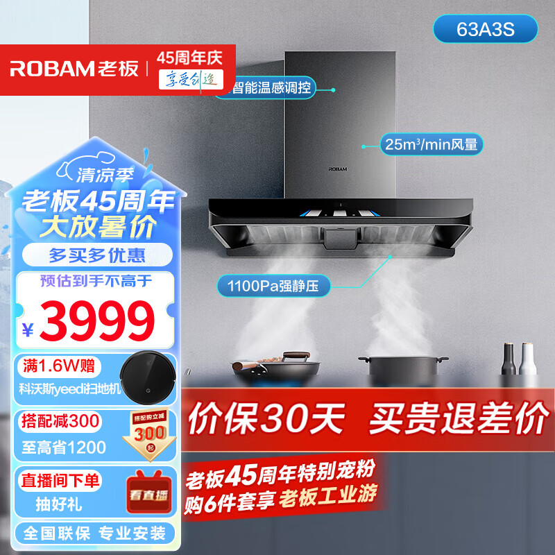 老板(Robam)油烟机63A3S灵犀全自动25立方风量大吸力吸油烟机钢琴按键变频智吸灵动三重控烟静吸抽油烟机 1100Pa静压 单烟机 变频烟机价格:3999.00元!