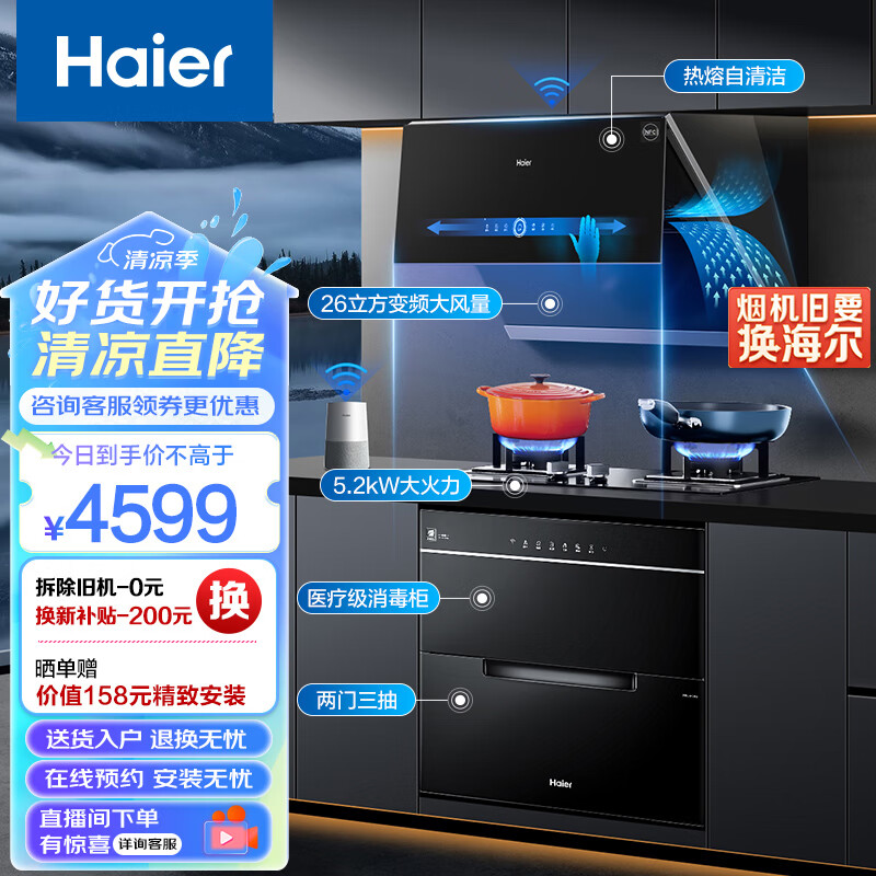 海尔(Haier)抽油烟机 烟灶消三件套 变频 26立方大吸力 5.2kw大火力 110L医疗级消毒柜EC911+Q2BE3天+E07JU1价格:4599.00元!