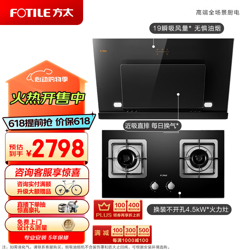 方太(FOTILE)抽吸油烟机灶具套装 侧吸式小户型家用烟灶套装 4.5KW换装灶具 JCD8A+02-TH33B天然气/液化气价格:2998.00元!