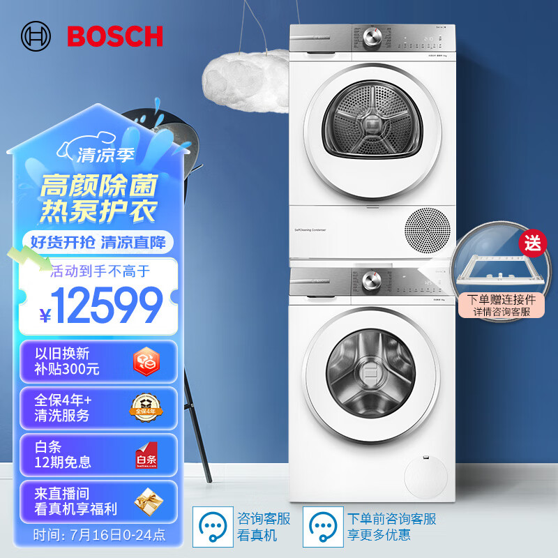 博世(BOSCH)洗烘套装6系10+10KG云朵白·设计师版大容量全自动滚筒洗衣机家用热泵烘干机高颜除菌254X00+254D00价格:12599.00元!