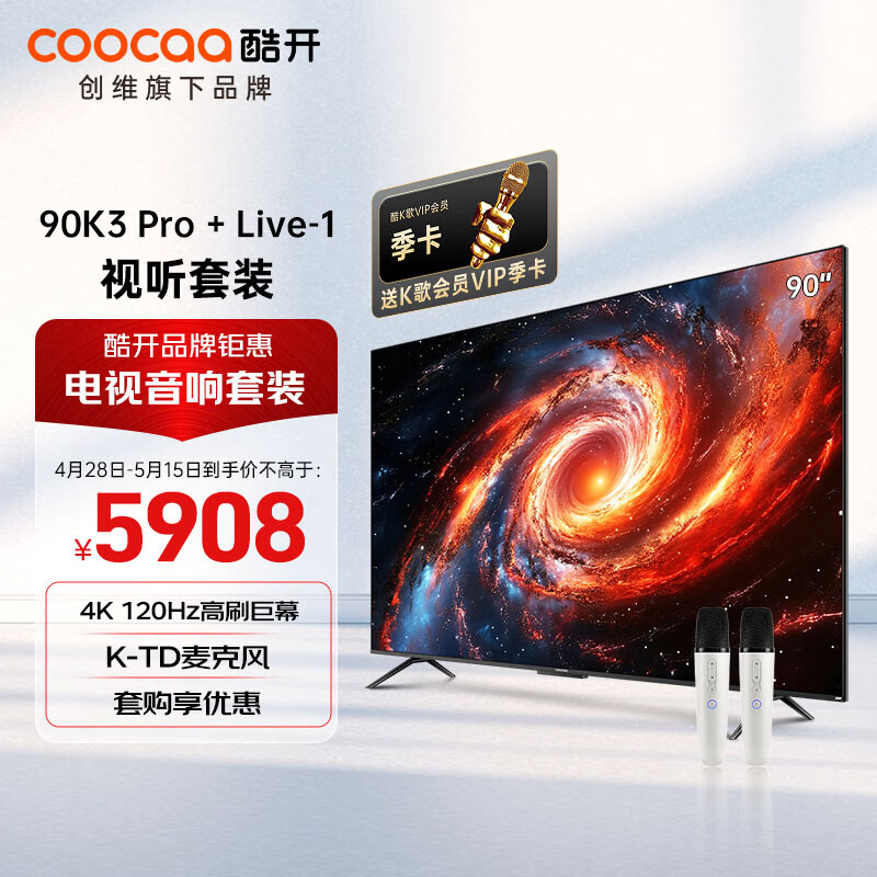 酷开创维 90英寸高刷电视机K3 Pro+K-TD麦克风套装 K歌电视 家庭KTV无线降噪话筒唱歌会议 双支麦克风价格:5908.00元!