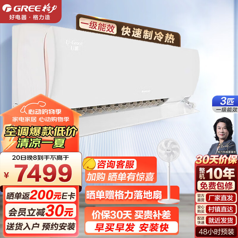 格力空调挂机 3匹/2匹 U雅 新一级能效 变频冷暖 自清洁 智能WIFI除湿 卧室壁挂式空调价格:7499.00元!