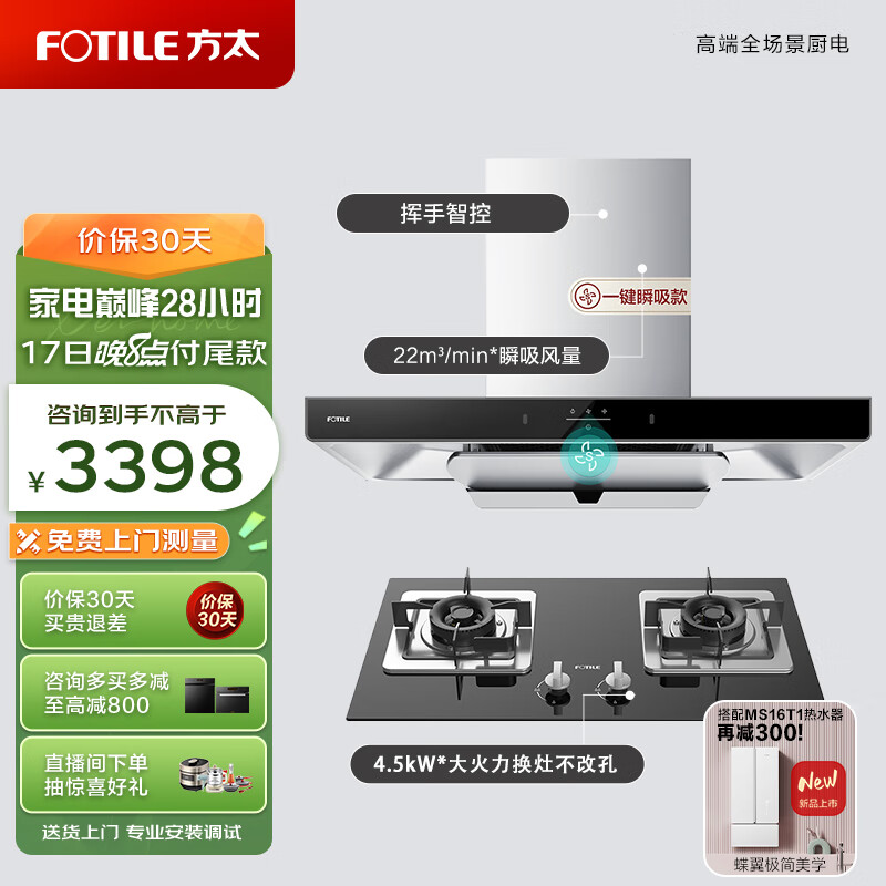 方太(FOTILE)抽吸油烟机烟灶套装 燃气灶烟机 欧式顶吸烟机灶具套装家用 22瞬吸风量烟灶套餐EMC5A+02-TH33B价格:3398.00元!